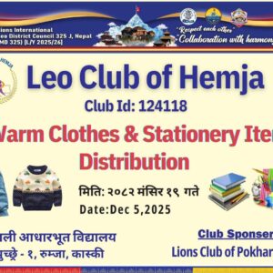 पोखरा २२ मंसिर लियो अन्तर्राष्ट्रिय लियो डे २०२५ को अवसर पारेर लियो क्लब अफ हेमजाले न्यानो कपडा तथा स्टेशनरी सामग्री…
