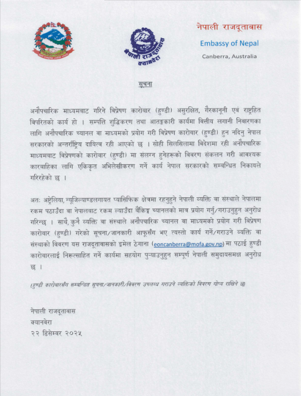 खोजी विशेष संवाददाता टुओम्बा २३, डिसेम्बर अष्ट्रेलिया स्थित नेपाली दुताबासले अष्ट्रेलिया, न्यूजिल्याण्ड लगायत प्यासिफीक देशहरुमा रहनुभएका नेपालीहरुलाई हुण्डी काराबोर नगर्न…